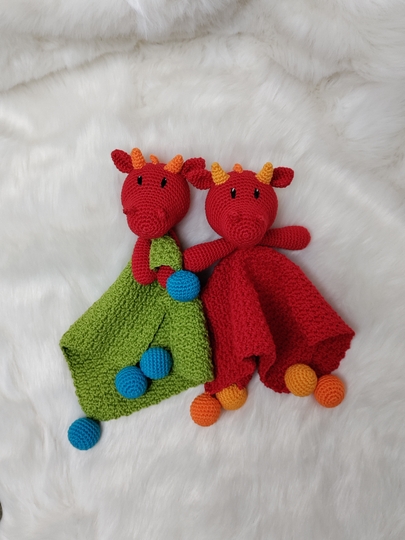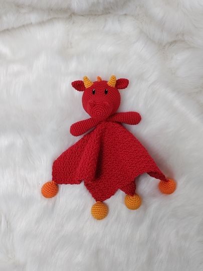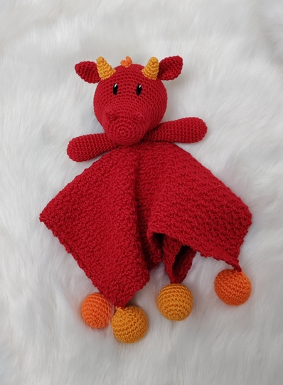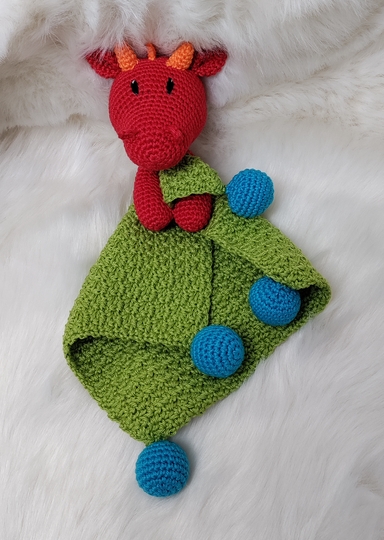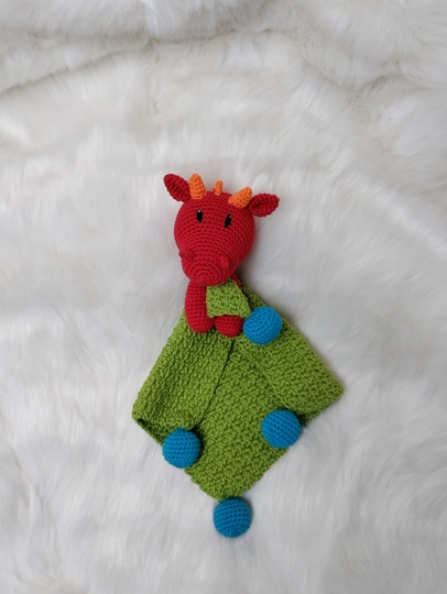 Angeboten wird hier eine ausführliche und gut bebilderte Häkelanleitung für das Schmusetuch Drache in zwei Varianten, nicht das fertige Schmusetuch. Die Anleitung umfasst 11 Seiten.