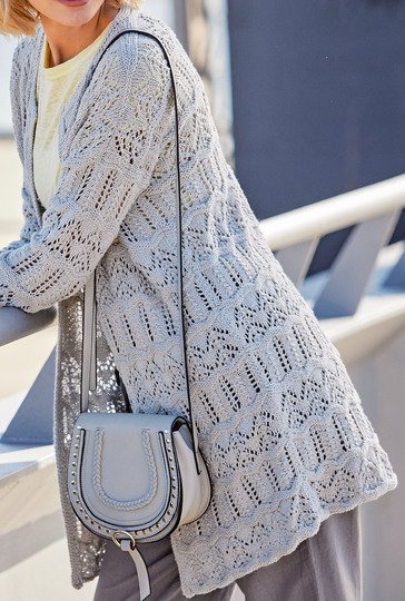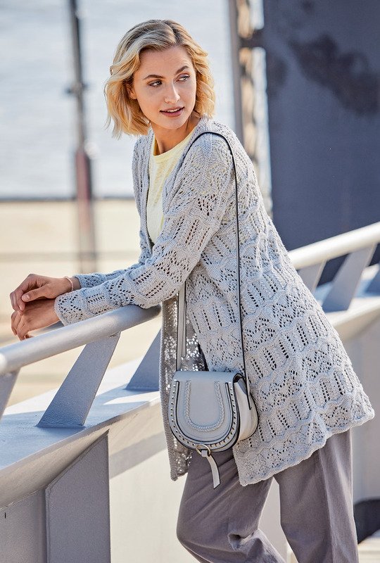Für so eine leichte Lace-Jacke ist immer ein Platz in unserer Garderobe – und im Reisekoffer. In einer eher neutralen und kombinationsfreudigen Farbe gestrickt gehört so ein luftiger Cardigan ganz schnell zu den Lieblingsstücken. Gestrickt wird in einzelnen Teilen von unten nach oben und allover im Ajourmuster - dieses benötigt schon Aufmerksamkeit, aber die übersichtliche Strickschrift hilft zusätzlich dabei, stets den Überblick zu behalten. Sind alle Teile fertig, werden noch die Nähte geschlossen und die Blenden gestrickt. Am besten nimmt der fertige Cardigan jetzt noch ein kleines Bad und wird im Liegen getrocknet. Dabei schön in Form bringen und glattstreichen – so öffnet sich das Lacemuster und entfaltet seine ganze Pracht.