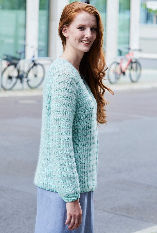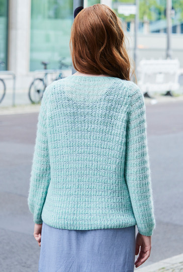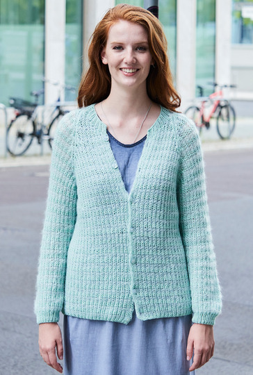Zurückhaltend monochrom, aber trotzdem sehr edel: Der klassische Cardigan im Wechselspiel aus glatter Schurwolle und flauschigem Mohairgarn passt sich jedem Stil perfekt an. Das feine Mohairgarn wird dabei stets doppelfädig verstrickt. So geht es im regelmäßigen Wechsel und im Halbpatent ganz entspannt voran. Die Vorderteilkanten erhalten einen direkt mitgestrickten Patentrand – das ist praktisch und sieht sehr gut und sauber aus. Die betonten Abnahmen an der Raglanlinie setzten diese geschickt in Szene und unterstreichen die Schnittführung