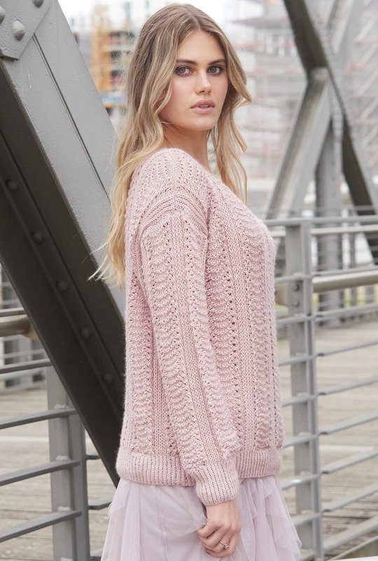 Der locker fallende Pulli aus Seide-Alpaka-Mischgarn in Pastellrosa ist sehr angenehm auf der Haut und strahlt feminine Lässigkeit aus. Das liegt am ausgewogenen Wechselspiel zwischen senkrechten Streifen im Wellenmuster und Halbpatentstreifen. Lange Ärmel, die an der überschnittenen Schulter enden und, wie auch der Saumbund und die Ausschnittblende Bündchen in einem feinen 1/1-Rippenmuster haben, das aus rechts verschränkten und linken Maschen gebildet wird. Der Halsausschnitt ist etwas weiter gearbeitet, so kommt das Dekolleté schön zur Geltung. Eine Anleitung gibt es für die Größen 34/36, 38/40 und 42/44.