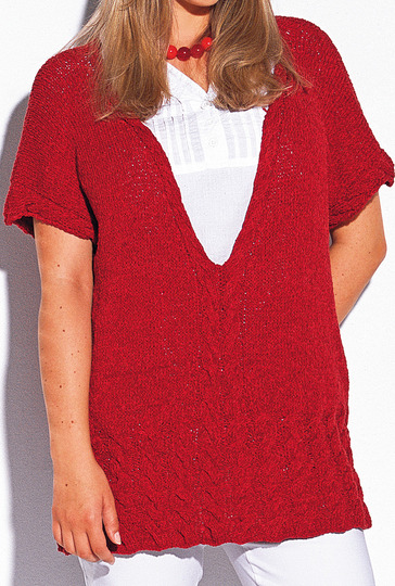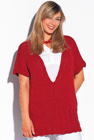 Bei dieser Tunika fallen gleich mehrere Aspekte ins Auge: der tiefe langgezogene V-Ausschnitt, der hohe Bund aus Zöpfen und die das knallige Rot. Durch den Zopfbund fällt der Pulli besonders schön und sieht auf Hose und Rock gut aus. Auch entlang der Ärmelränder und dem Ausschnittrand verläuft ein einzelner Zopf. Die angeschnittenen Ärmel werden an Vorder- und Rückenteil gleich mitgestrickt, so müssen nach dem Zusammennähen hier keine Maschen mehr aufgefasst werden. Eine Anleitung gibt es für die Größen 44/46, 48/50 und 52/54.