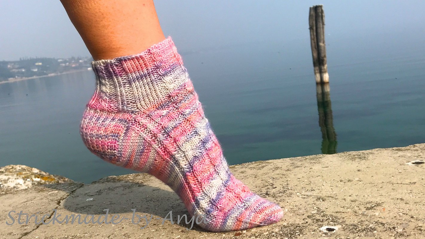 Die PDF Datei enthält die Anleitung für 3 Paar Sneakersocken aus 2x 100g Sockenwolle, passend für die Größen 36/37, 38/39 und 40/41.