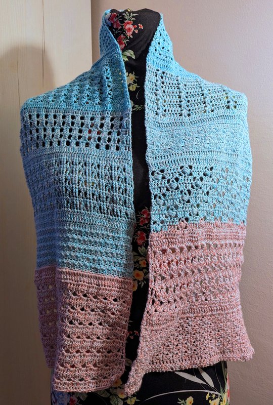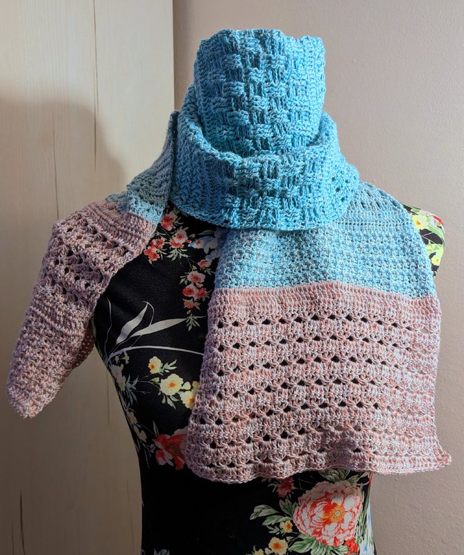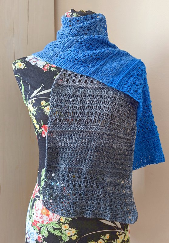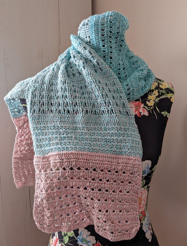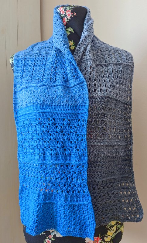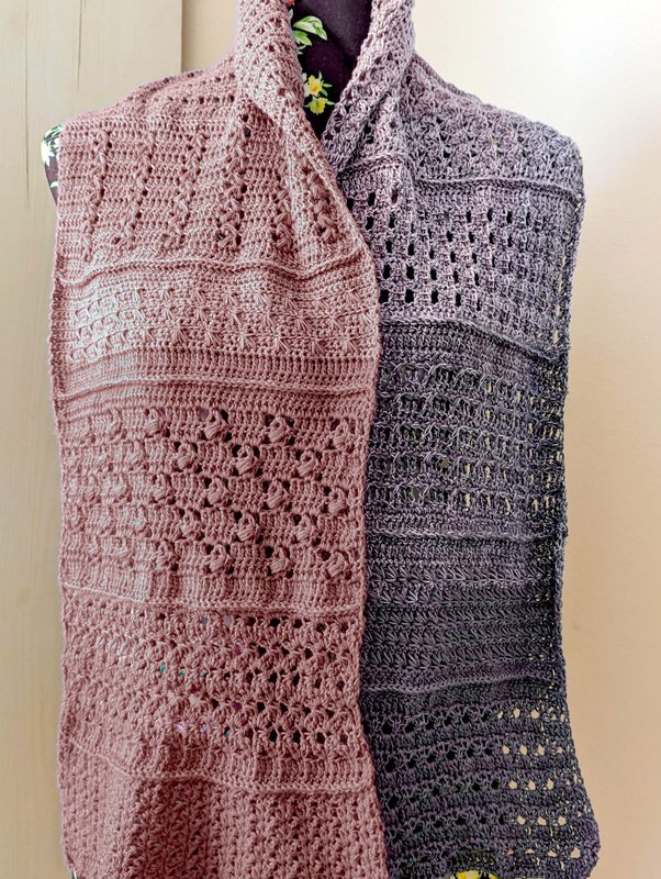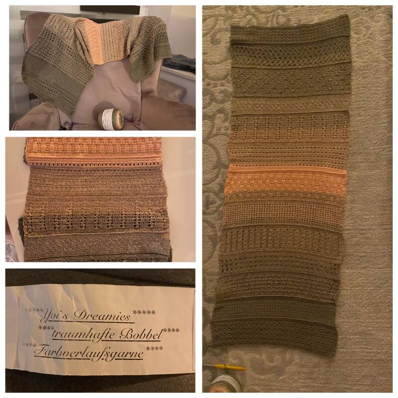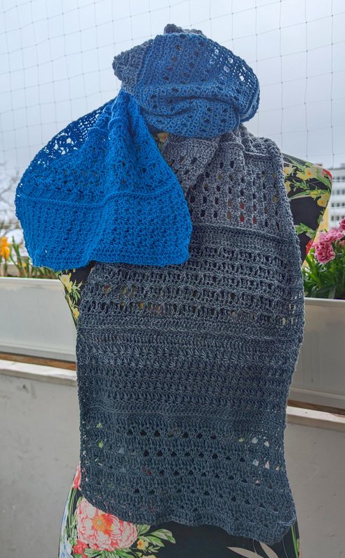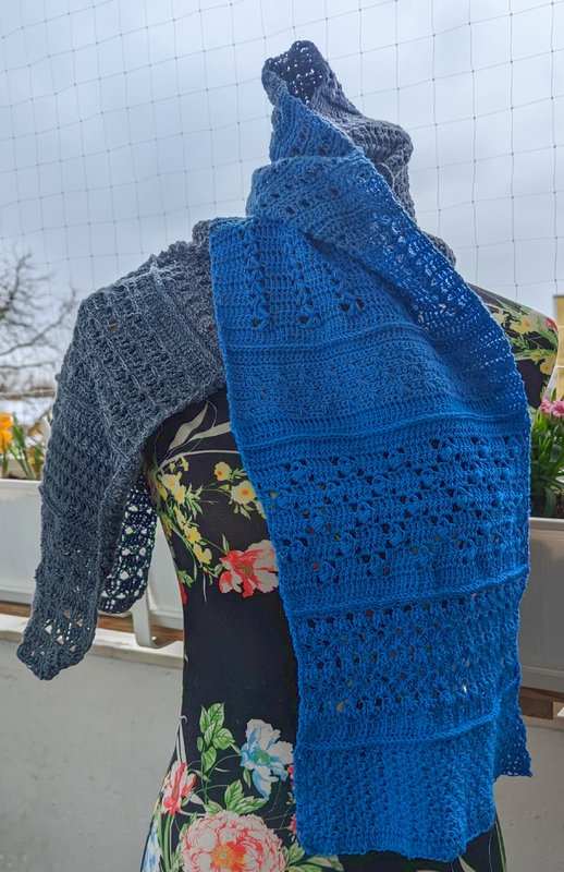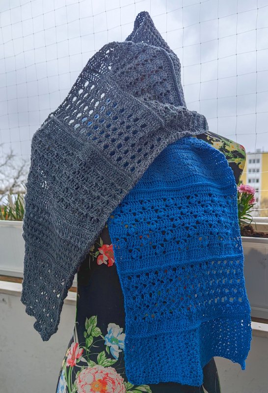 Ich habe je einen Bobbel 3fadig mit 50/50 (Baumwolle/Polyacryl) verwendet. Schal 1 hat 680m verbraucht, Schal 2 hat ca 750m verbraucht.