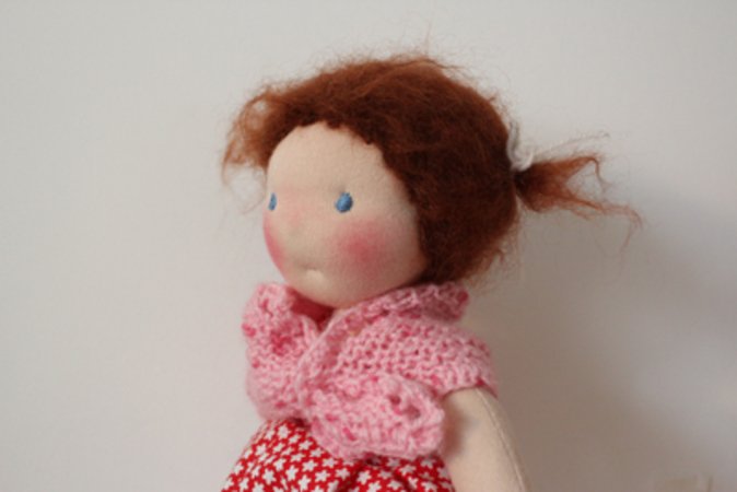 Man kann ihn aber leicht durch Variieren der angeschlagenen Maschen bzw. der letztlich gestrickten Länge auch für noch kleinere bzw. größere Puppen anpassen.