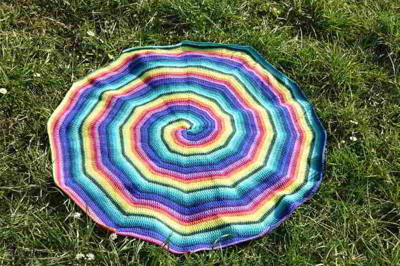 Diese Decke kann je nach Garnwahl als Decke oder als Teppich verwendet werden. Die Decke kann mit 2, 3, 4, 6 oder 12 verschiedene Farben für die Spirale gehäkelt werden. Die Decke wird hauptsächlich in Stäbchen gehäkelt. Die Decke kann in einer beliebigen Größe gehäkelt werden, da das Muster einfach fortgesetzt werden kann, bis die gewünschte Größe erreicht ist.