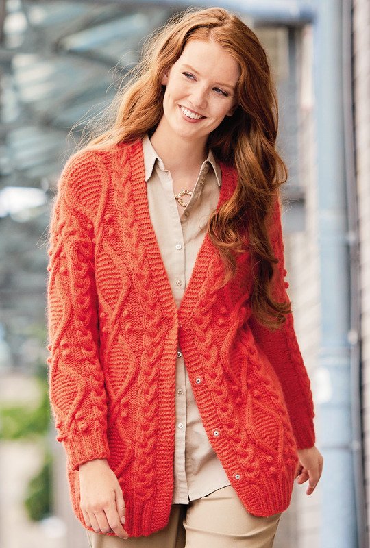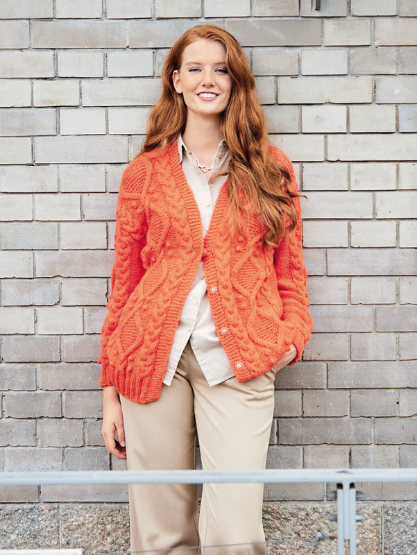 In strahlendem Korallenrot wird die Jacke mit Rauten und Zöpfen zum Muster-Highlight. Transparente Druckknöpfe fungieren als Verschluss und verleihen den modischen Touch. Gestrickt wird in einzelnen Teilen von unten nach oben. Die Mustervielfalt benötigt zwar durchaus ein wenig Aufmerksamkeit, aber die klaren Strickschriften für die Zöpfe und Noppen in der Anleitung helfen dabei, stets den Überblick zu behalten. Praktisch: Die Rippenblenden werden direkt mitgestrickt. So müssen zum Schluss nur noch die Nähte geschlossen und die Druckknöpfe angenäht werden.