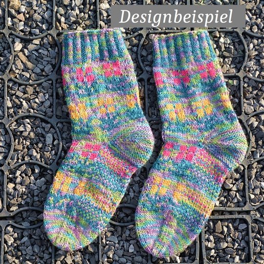 Ich habe die Socken mit vierfach Sockenwolle ab Grösse 33/34 bis zur Grösse 39 gestrickt. Eine meiner Teststrickerinnen hat noch eine Bordure dazu gestrickt und so noch grössere Socken erhalten. Lasse deiner Fantasie freien Lauf! Je nach dem welchen Maschenanschlag du machst und welche Nadelstärke du verwendest oder wie locker du strickst, kannst du die Endgrösse der Socken varieren.