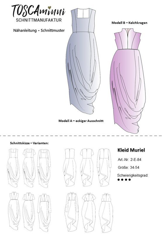 Mit dem Schnittmuster Muriel nähst Du Dir ultraschickes Kleid, mit dem Du mit Sicherheit viele Komplimente ernten wirst. Es stehen Dir 2 Oberteilvarianten zur Verfügung und du kannst zwischen ärmellos - kurzarm und langarm wählen. Der Rock hat vorne eine üppige Falte und im Rücken eine kleine Schärpe als Hingucker angedeutet.