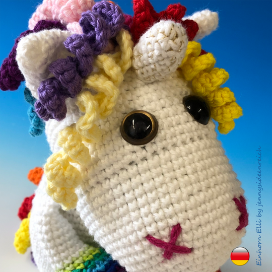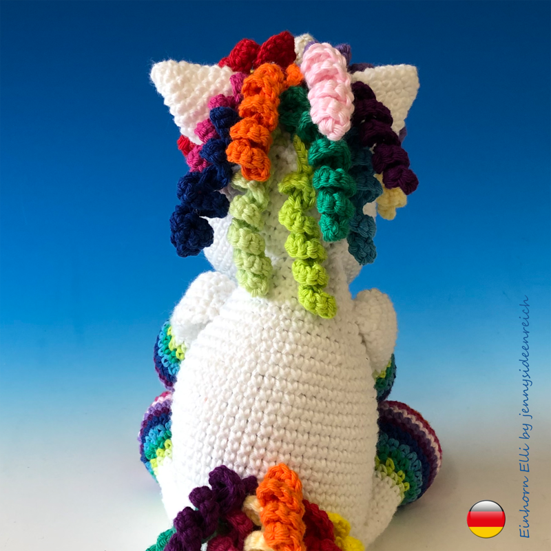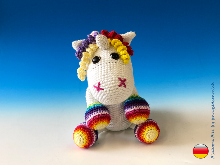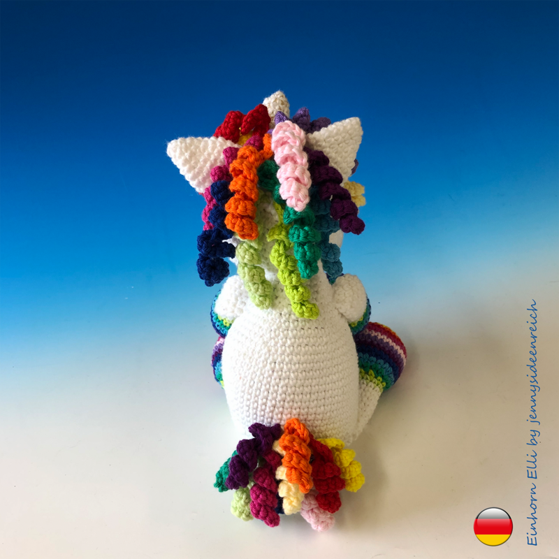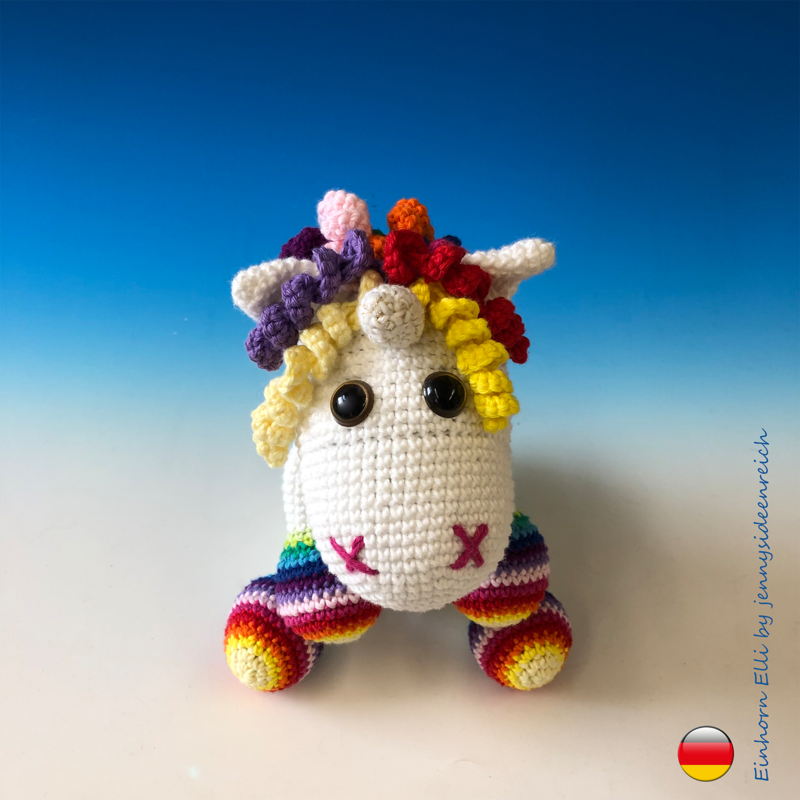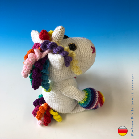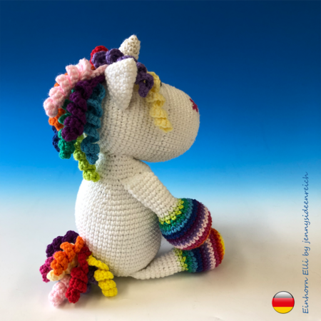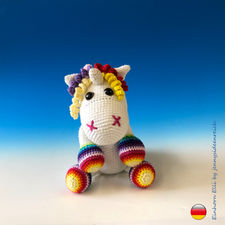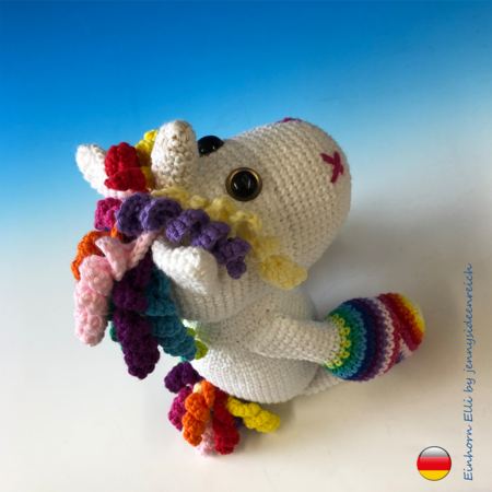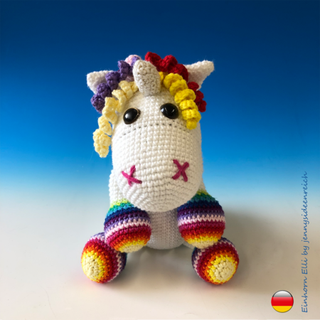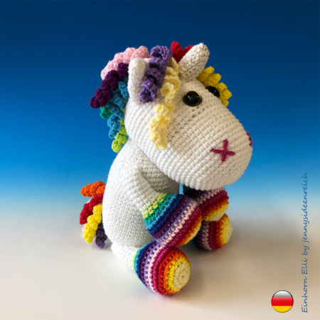 Ihr könnt hier die komplett ausformulierte Häkelanleitung zu Elli dem Regenbogeneinhorn erwerben