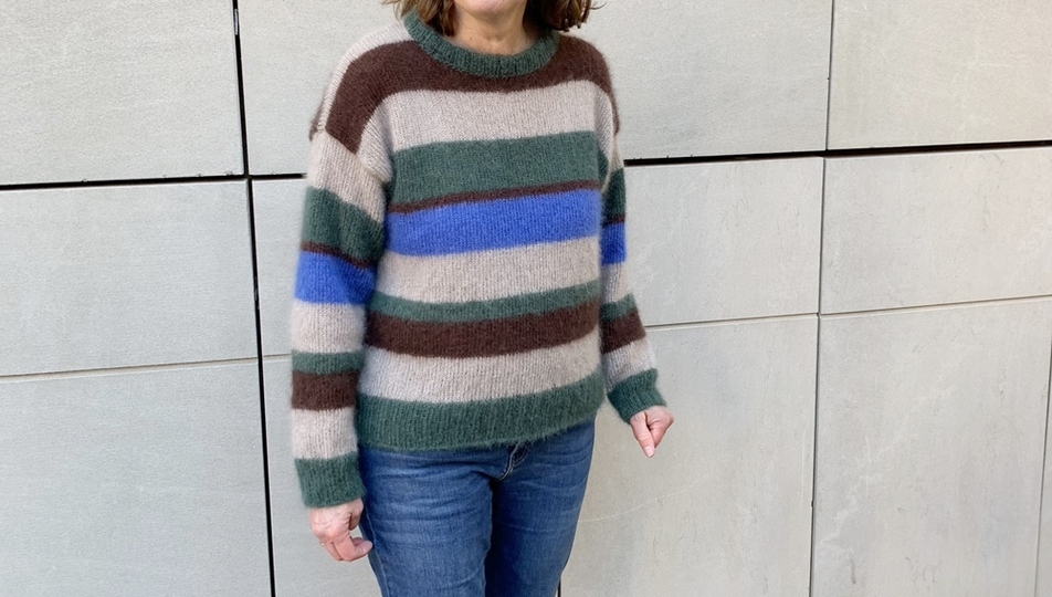 Der legere Streifen-Pullover wird durchgehend zweifädig von unten nach oben gestrickt. Jedes Teil wird separat gearbeitet und später angenäht bzw. zusammengenäht. Der Pullover hat überschnittene schräge Schulterpartien.