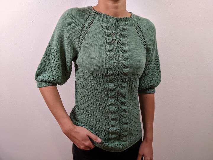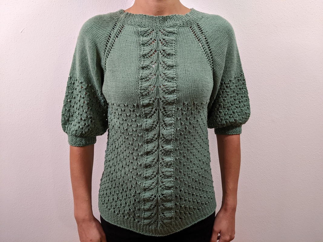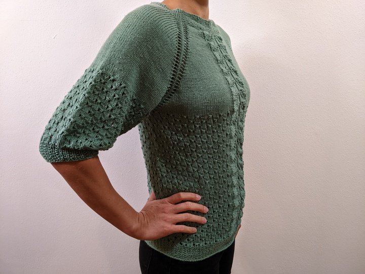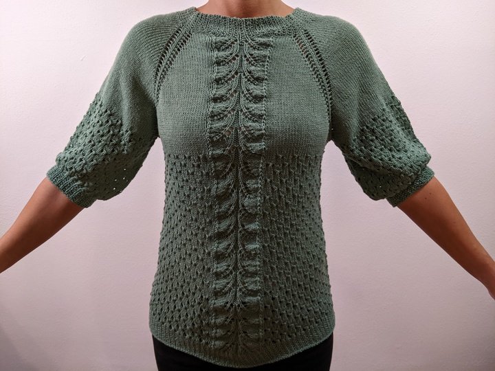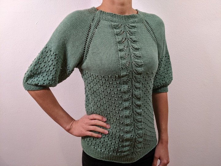 Dieser Kurzarmpulli mit aufregendem Lochmuster und elegantem Blattmuster-Streifen wird von oben nach unten in einem Stück – ohne Zusammennähen einzelner Teile – gestrickt. Die schräg verlaufenden Raglanlinien in Loch-Optik sind ein zusätzlicher Hingucker.
