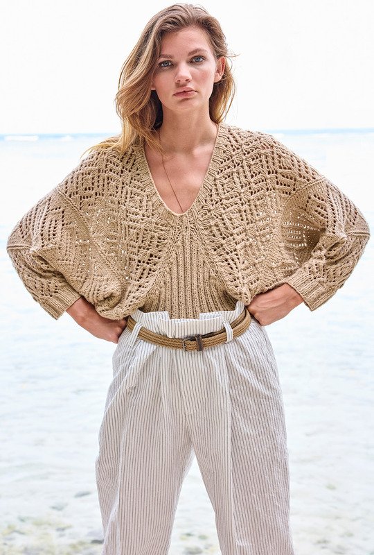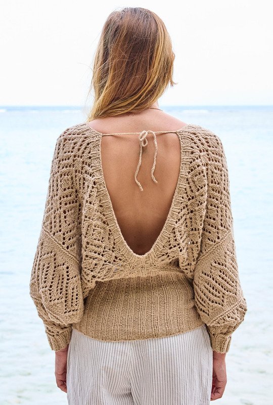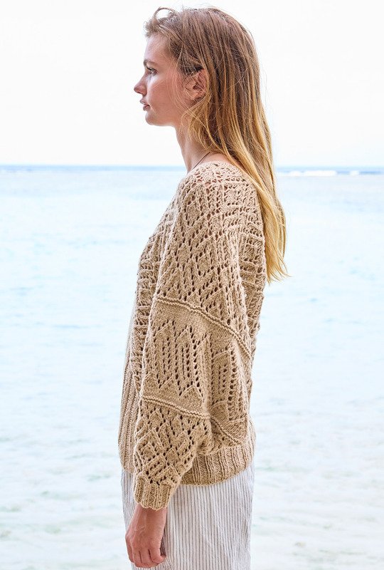 Mit individuellen Strickdesigns begeistert die Masche einmal mehr und zeigt, wie beeindruckend verschiedene Stricktechniken zum Einsatz kommen können. Hier als Pulli mit weiten Ärmeln und tiefem V-Ausschnitt. Gleich zwei Ajourmuster, Rippenmuster, kraus rechts und glatt rechts gestrickte Partien bieten jede Menge Strickvergnügen. Für die Ajourmuster benötigt es durchaus Konzentration - die übersichtliche Strickschrift hilft jedoch dabei, stets den Überblick zu behalten. Zusätzlich muss genau darauf geachtet werden, dass bei den Zu- und Abnahmen die Umschläge und zusammengestrickte Maschen stets ausgeglichen bleiben. Sind alle vier Teile fertig, werden die Nähte geschlossen und aus dem Halsausschnitt noch die Blende im Rippenmuster herausgestrickt. Dann werden an den Schultern noch die Luftmaschenketten angebracht und im Rücken miteinander verknotet.