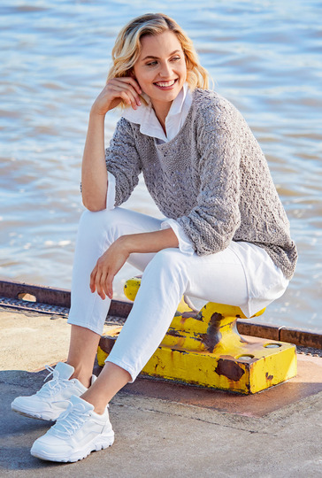 Zugegeben, für dieses raffinierte, zarte Design braucht es schon ein wenig Geduld – aber der Aufwand wird durch einen ganz besonders schönen Pulli belohnt, der ebenso feminin, wie zeitlos ist. Gestrickt wird in einzelnen Teilen von unten nach oben. Die Musterfolge wird in der Anleitung detailliert beschrieben und für das Ajourmuster gibt es zusätzlich übersichtliche Strickschriften. Sind alle Teile fertig, werden noch die Nähte geschlossen und der Halsausschnitt wird mit einer Runde fester Maschen umhäkelt. Am besten nimmt der Lacepulli dann noch ein kleines Bad und wird schön glatt ausgestrichen und liegend getrocknet. Dabei entfaltet das Ajourmuster seine volle Schönheit.
