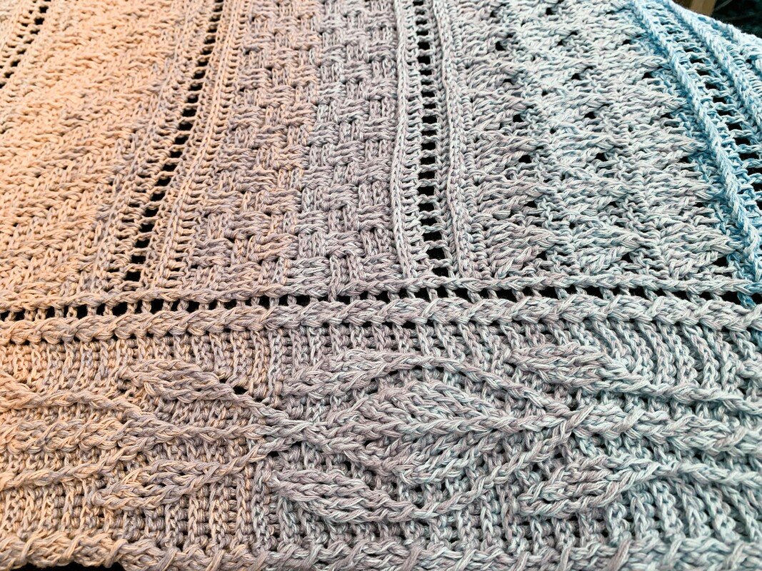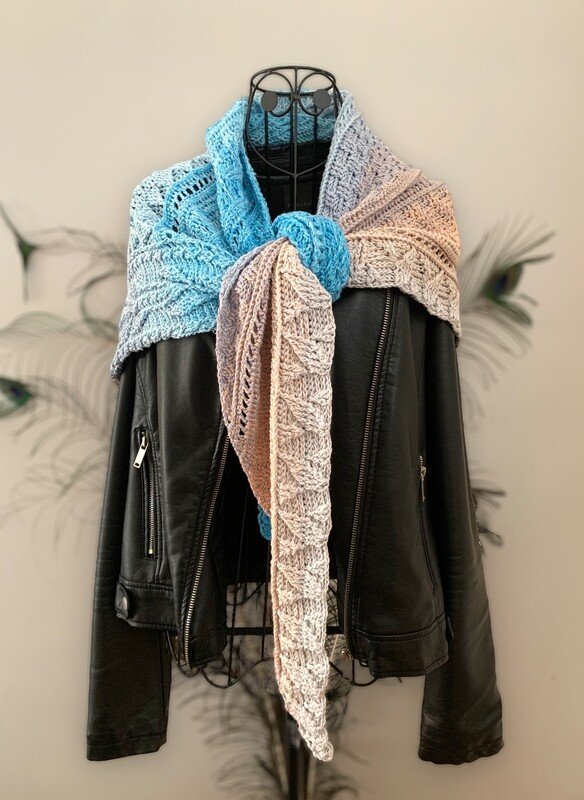 Das Tuch besticht durch ein etwas aufwändigeres Blättermuster, das am Rand des Tuchs verläuft, und verschiedene Muster aus Reliefstäbchen entlang des restlichen Tuchs. Das Blättermuster (die dichte Version des Tuchs Perimede) braucht ein wenig mehr Aufmerksamkeit beim Häkeln, der Rest ist absolut fernsehtauglich!
