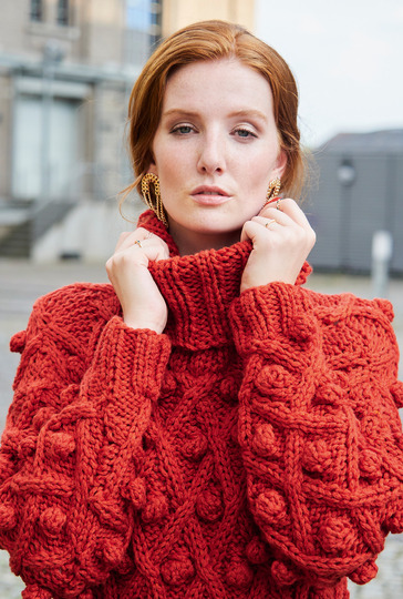 Comeback für Noppen: Bei diesem topmodischen Rolli werden sie in ein Rautengeflecht integriert – sieht stark aus und macht Eindruck! Noppen und verkreuzte Maschen sind sehr typisch für Island und auf den Aran-Inseln – in diesem Design wird gekonnt gezeigt, wie dynamisch und kraftvoll modern die Traditionsmaschen daherkommen können. Das Muster benötigt Anfangs schon Konzentration, aber die übersichtliche und klare Strickschrift in der Anleitung hilft dabei, den Überblick zu bewahren – schnell wirst du feststellen, dass Noppen zu stricken süchtig machen kann! Gestrickt wird in einzelnen Teilen von unten nach oben. Sind alle vier Teile fertig gestrickt, werden noch alle Nähte geschlossen und aus dem Halsausschnitt der Rollkragen im Rippenmuster herausgestrickt.