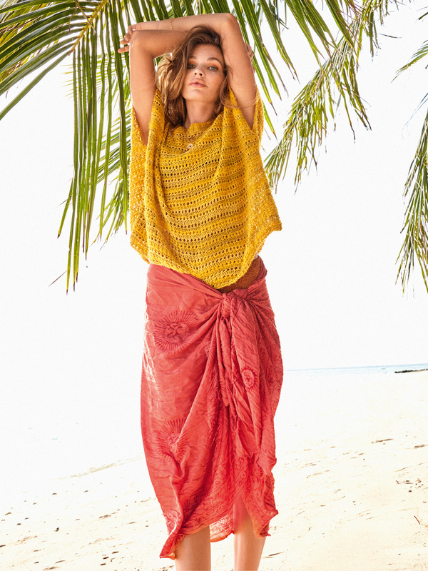 Hier sind sie, die Essentials für einen Tag am Meer: Bikini, Strandtuch und ein locker fallendes Stricktop, das mit seinem knallgelben Fancygarn Blicke auf sich zieht. Der spannende Mix aus drei unterschiedlichen Garnen – Baumwolle, Flausch & Leinen – macht richtig viel Spaß beim Verstricken und braucht keine komplizierten Muster. So wird hier auch nur ein ganz einfaches Lochmuster verwendet, das luftige Leichtigkeit bietet, dem Garn nicht die Show stiehlt und bereits nach wenigen Reihen verinnerlicht ist. Sind Vorder- und Rückenteil jeweils von unten nach oben fertig gestrickt, werden nur noch die Nähte geschlossen und die Blende für den Halsausschnitt angestrickt.