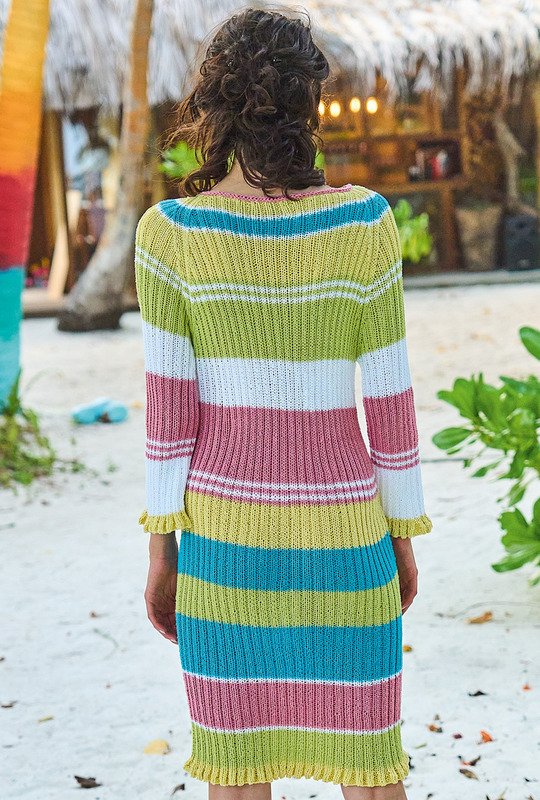 Das Rippenmuster dieses Strickkleides passt sich perfekt den Körperkonturen an und verwandelt sich auf Brusthöhe in eine Passe mit Raglanlinien. Das Finish bilden schmale Rüschenblenden für einen Schuss Romantik. Sowohl das Rippenmuster, das Rüschenmuster und die Streifenfolgen sind unkompliziert zu stricken und zudem in der Anleitung Reihe für Reihe genau erklärt. Alle Einzelteile werden bis zur Passenhöhe von unten nach oben gestrickt. Danach werden alle Teile gemeinsam auf die Stricknadel genommen und in Runden fertig gestrickt. Danach werden nur noch die Nähte geschlossen und der Halsausschnitt erhält noch einen dekorativen I-Cord-Rand.