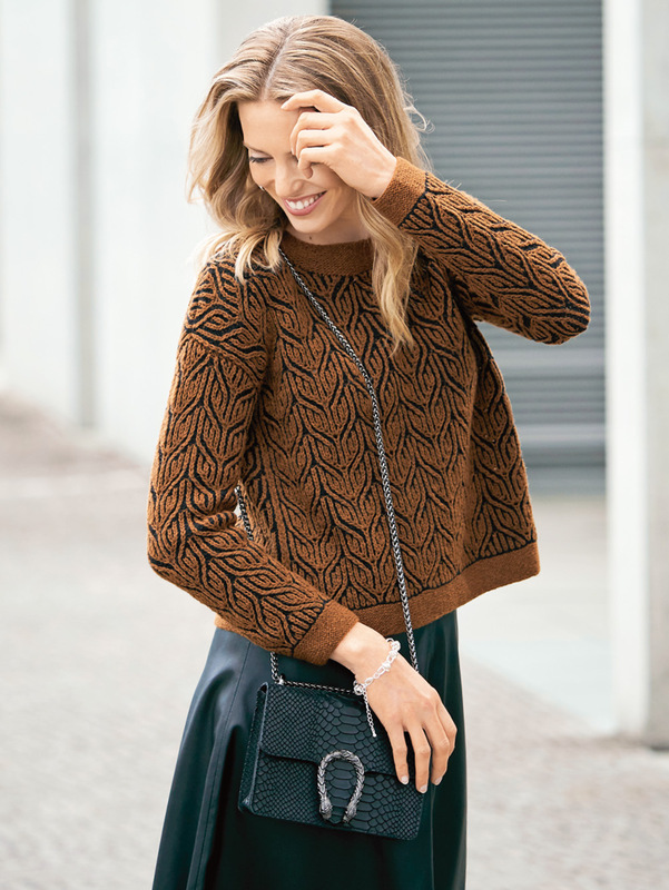 Zugegeben, Briochemuster sind nicht ganz einfach, aber mit ein bisschen Übung bereichern sie deine Garderobe mit diesem wunderschönen Pulli aus edlem Schurwoll/Kaschmir Garn. Die Farbkombination Schwarz und Braun gibt dazu einen eleganten und zeitlosen Spirit, der wunderbar mit dem Muster harmoniert. Gestrickt wird in einzelnen Teilen von unten nach oben allover im Muster. Dieses ist in einer klaren und übersichtlichen Strickschrift dargestellt, welche den Überblick erleichtert. Sind alle vier Teile fertig gestrickt, werden noch alle Nähte geschlossen und aus dem Halsausschnitt die Blende im herausgestrickt.