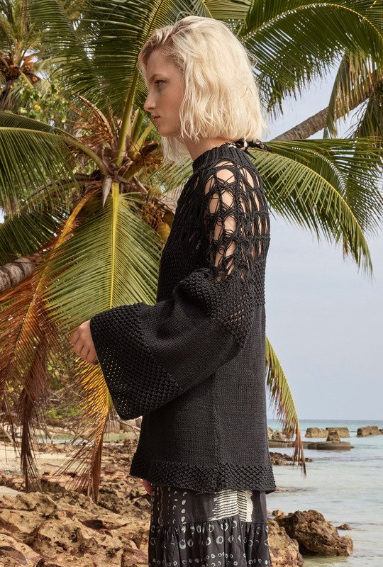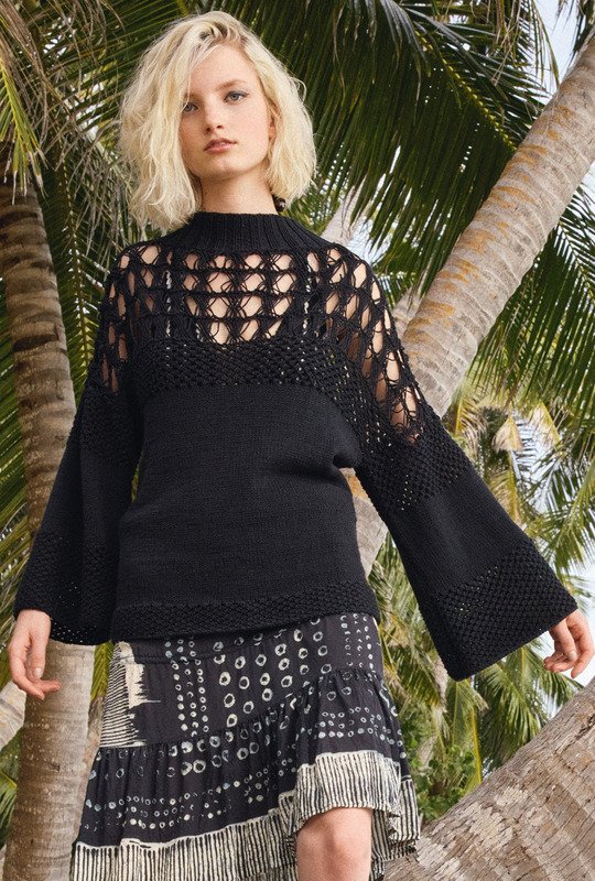 Transparenz trifft bei diesem Pulli ins Schwarze. Sie entsteht durch lange, miteinander verkreuzte Fallmaschen, die im oberen Bereich viel Luft an die Haut lassen. Das Ergebnis kommt mit einem Hauch Extravaganz und sehr viel Chic daher! Gestrickt wird hier erst das Rückenteil, dann das Vorderteil, gefolgt von den Ärmeln. Nach dem Bündchen im Netzmuster folgt erst einmal ein guter Abschnitt glatt rechts gestrickter Maschen. Dabei geht es gut und schnell voran. Noch bevor hierbei Langeweile aufkommen könnte, geht es wieder weiter mit dem Netzmuster, dem sich das Fallmaschenmuster anschließt. Beide Muster benötigen zwar ein wenig Aufmerksamkeit, sind aber nicht schwierig zu stricken und zudem ausführlich in der Anleitung Reihe für Reihe beschrieben. Sind alle vier Teile fertig gestrickt, werden noch alle Nähte geschlossen und aus dem Halsausschnitt die Blende im Rippenmuster herausgestrickt.