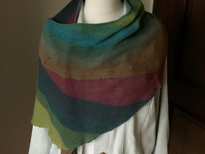 „Belanna“ ist ein asymmetrisches „riesiges“ Tuch mit einer Größe von ca. 40 cm (breit) x 260 cm (lang), andere Größen sind ganz einfach möglich, indem man die Anzahl der Rapportwiederholungen verändert. Dies sollte man jedoch beim Garnkauf berücksichtigen. Die Formgebung des Tuches kommt durch das Arbeiten von verkürzten Reihen, Der Farbverlauf kommt aus dem Knäul. Den gleichen Farbeffekt erreicht man, wenn man ein Garn mit einem langen Farbverlauf verwendet