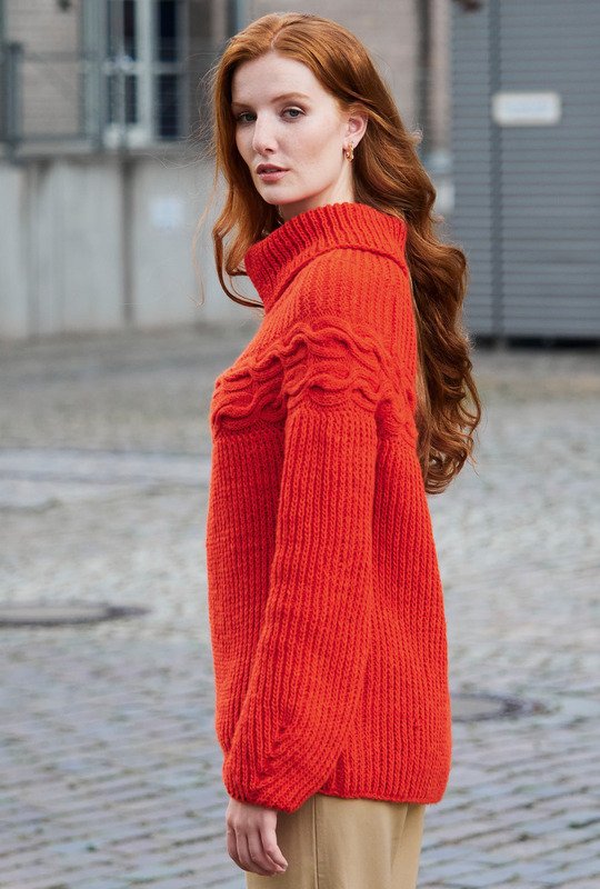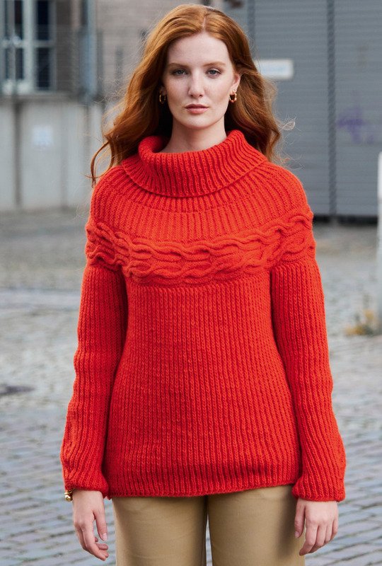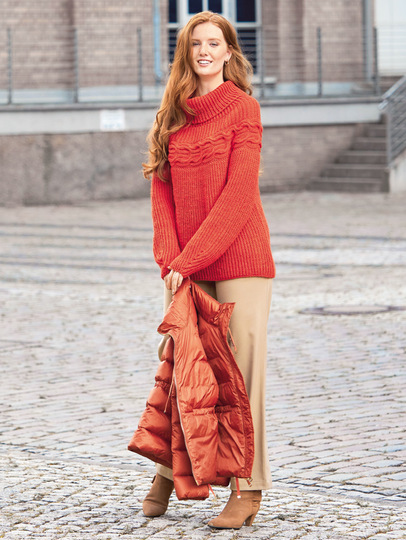 Das beste Rezept gegen kalte Wintertage: Knallrot! Hier als Pulli mit "patenten" Rippen und markanter Zopfpasse, die gekonnt den Schulterbereich betont. Und was für ein Strickspaß! Erst werden Rückenteil, Vorderteil und Ärmel bis zur Passenhöhe einzeln im Halbpatent gestrickt. Danach dann quer die Zopfpasse. Jetzt die Nähte schon einmal schließen, die Zopfpasse an den oberen Pulloverrand nähen, für die obere Passe die Maschen aus der Zopfpasse herausstricken und nun immer im Halbpatent in Runden stricken. Für die quer gestrickte Passe mit den Zöpfen beinhaltet die Anleitung eine klare und übersichtliche Strickschrift.