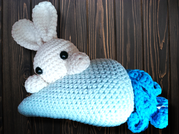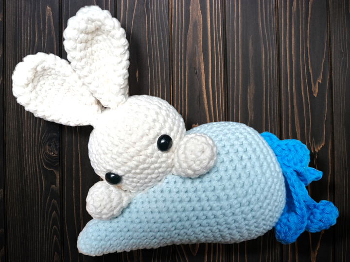 Scheepjes Cahlista in Hellblau, dunkelblau und Creme mit Sicherheitsaugen 10mm.