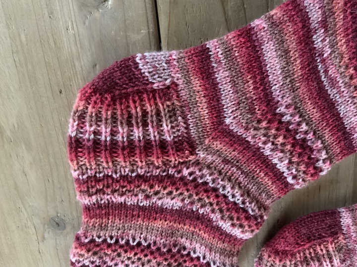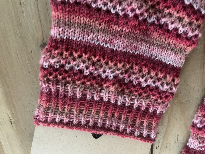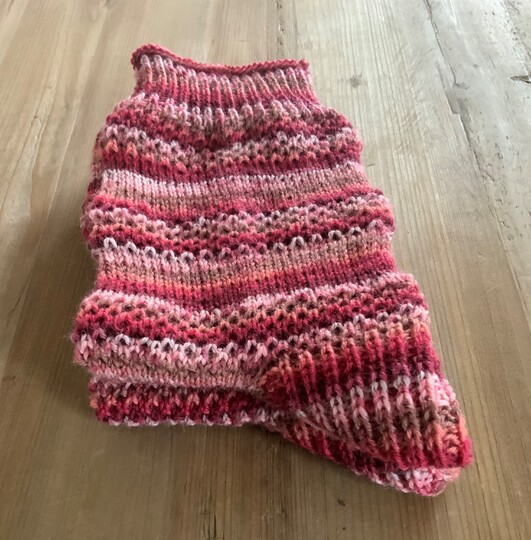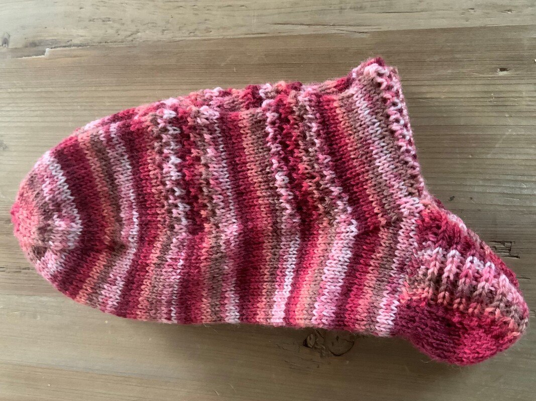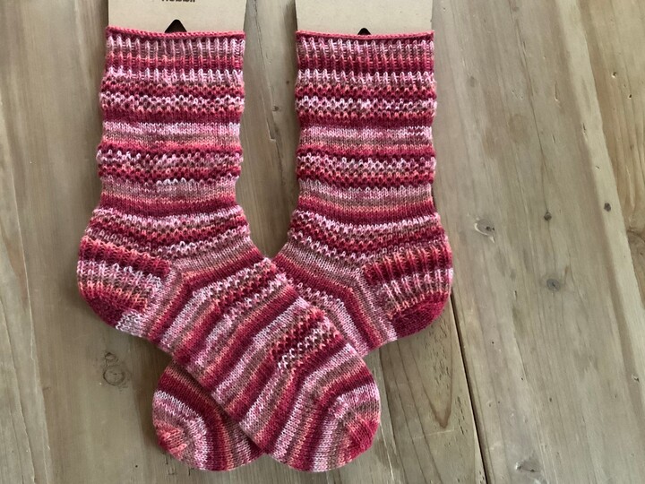 Mustersocken sind aus myboshi MYSOCKS, Farbe Knudsen (W73622) rot/bordeaux/rosa/beige