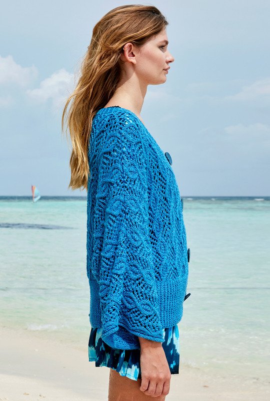 So musterstark zeigt sich der Sommer: Markante Zopf-Ajourstrukturen bringen Bewegung in die Masche. Das Finish dieser aparten Fledermausjacke bilden hohe Bündchen und farbliche passende Knöpfe. Gestrickt wird in drei Teilen von unten nach oben. Das ausdrucksvolle Muster benötigt zwar ein wenig Aufmerksamkeit, aber die klare Strickschrift in der Anleitung hilft dabei, stets den Überblick zu behalten. Sind alle Teile fertig gestrickt, werden noch alle Nähte geschlossen und die Blenden im Rippenmuster herausgestrickt, die Ärmelabschlüsse erhalten ihren Rollrand und di passenden Knöpfe bilden das perfekte Finish.