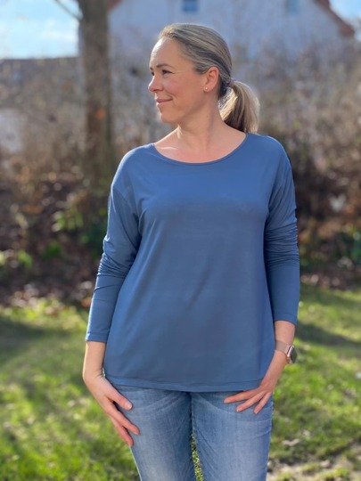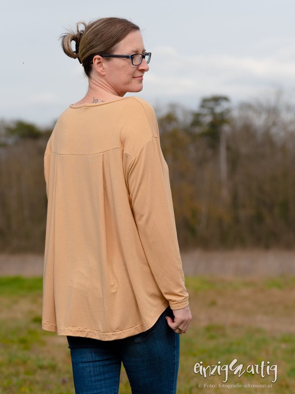 BURGAU ist ein Oversize-Shirt mit zwei Falten im Rückenteil. So entsteht ein lässiger Look. Das Shirt gibt es in den Größen 34-56.