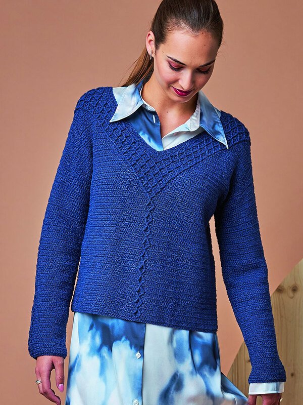 Insgesamt ist dieser Häkelpulli ein wunderschönes Kleidungsstück, das sicher viele Blicke auf sich ziehen wird. Seine Kombination aus luxuriösem Material, seidenweicher Textur, einem schönen Muster und einem tollen Blauton macht ihn zu einem echten Highlight in der Garderobe.