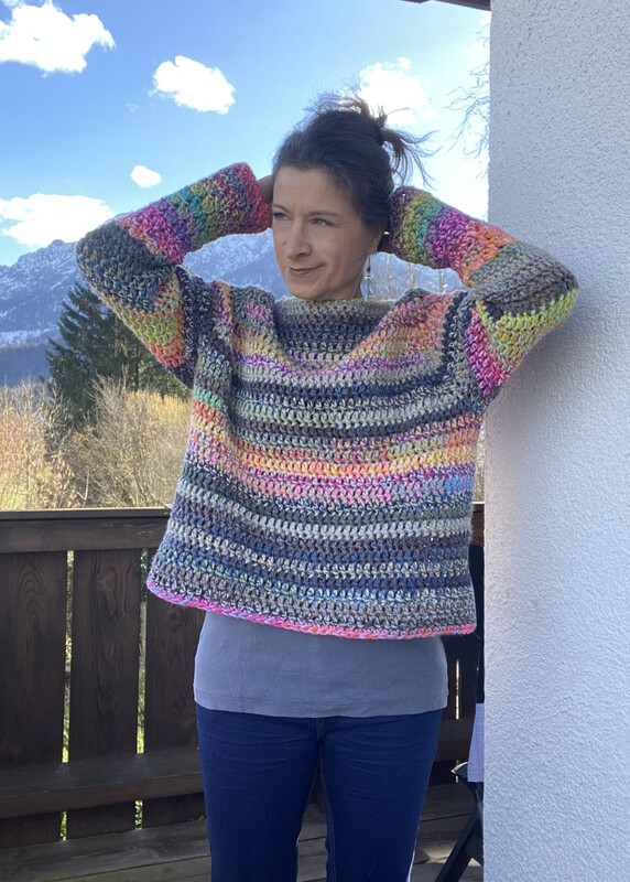 Die Passform ist oversized und somit sehr bequem. Gehäkelt wird nahtlos von oben nach unten mit Raglanzunahmen – erst der Körper, dann werden die Ärmel angehäkelt. Ein Blickfang sind die bunt-leuchtenden Ärmelabschlüsse in einem einfachen Muster, das sich gut vom Rest abhebt.