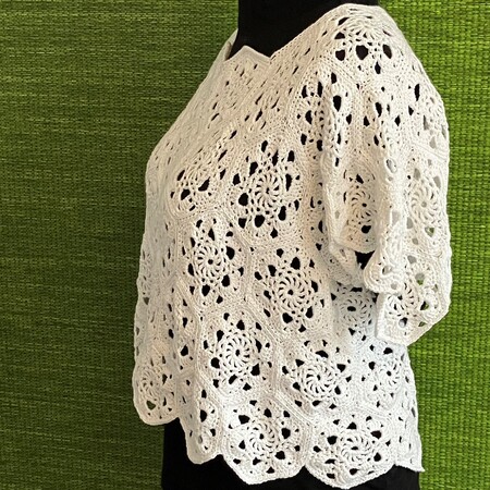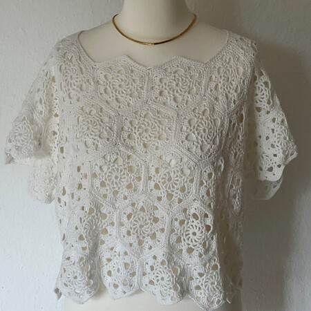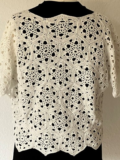 Grannys müssen nicht unbedingt quadratisch und bunt sein, sie können auch - wie hier gewählt - sechseckig und einfarbig sein. Ich finde, das sieht besonders edel aus, Das Shirt ist so geschnitten, dass ein evtl.vorhandenes Bäuchlein weggeschummelt werden kann, denn es fällt vom Busen aus gerade herunter und sitzt damit locker und zeitlos schön. Man kann das Shirt einfach auf der bloßen Haut tragen, oder einen schlichten Pulli damit aufhübschen.