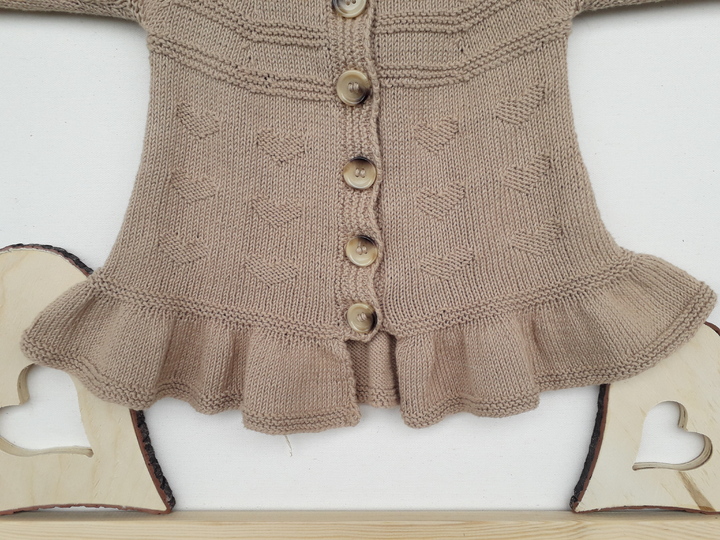 Die genauen Maße entnimm bitte der Beschreibung. Die Jacke hat viele nette Details wie Volant, Rundpasse und Herzmotive und hält Ihren Schatz in der Übergangszeit warm. Die Weste ist aus reiner Baumwolle gestrickt, ideal für kühlere Sommertage und passt perfekt zur Jeans oder zu einem hübschen Kleidchen. Ihr kleiner Schatz wird bestimmt viele Blicke auf sich ziehen, wenn sie diese Jacke trägt.