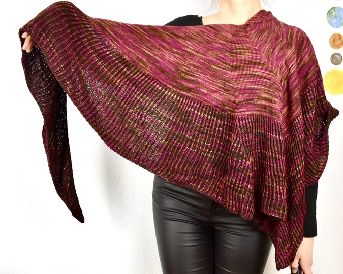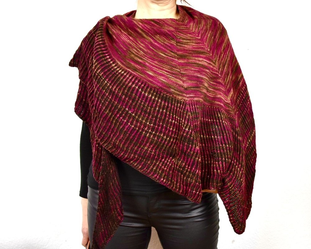 Aus leichtem Lace-Garn wird es trotzdem nicht zu schwer, und weil der Tuchkörper in Runden gestrickt wird, kommen Multifärbungen besonders gut zur Geltung. Für den Patentrand wird eine Kontrastfarbe hinzugenommen, die Du zur Hauptfarbe harmonierend wählen oder richtig knallen lassen kannst.