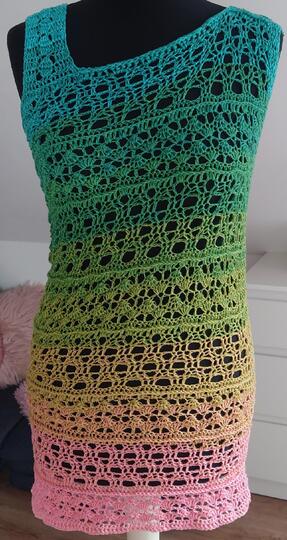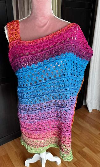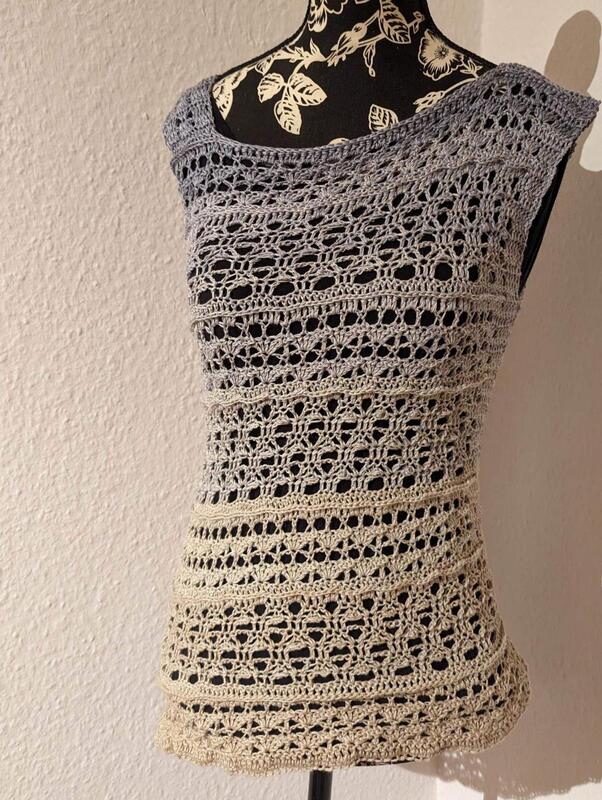Das Besondere an der Tunika ist, dass sie von unten nach oben gehäkelt wird und dadurch seine leicht schräge Form erhält.