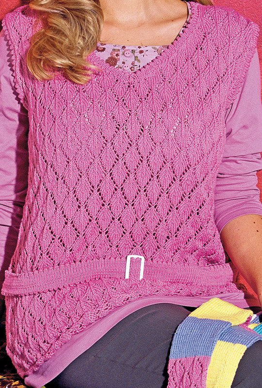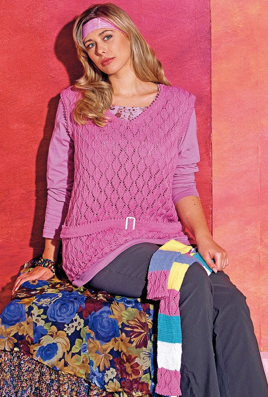 Top oder Pullunder? Diese Frage stellt sich eigentlich nicht, denn dieses Modell kann beides. Wer mag, strickt sich noch einen schmalen Schal mit breiten bunten Streifen in glatt recht und dem rosafarbenen Ajourmuster des Tops. V-Ausschnitt und die Ärmelränder haben einen sogenannten Mäusezähnchenrand. Als schmückendes Accessoire gibt es noch einen Gürtel, der ebenfalls mit Mäusezähnchen daherkommt. Als Pullunder über einer Bluse getragen ist dieses Modell prima geeignet fürs Büro, als Top passt es in der Freizeit genauso gut zur Jeans. Die Anleitung dazu gibt es für die Größen 42/44, 46/48 und 50/52.