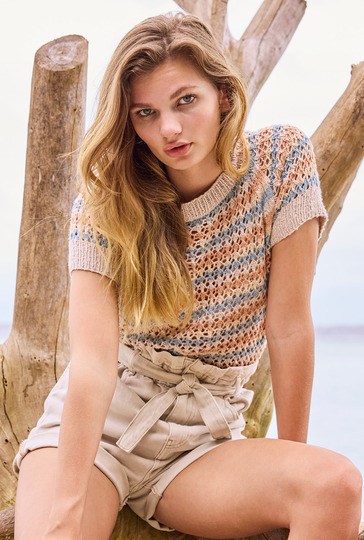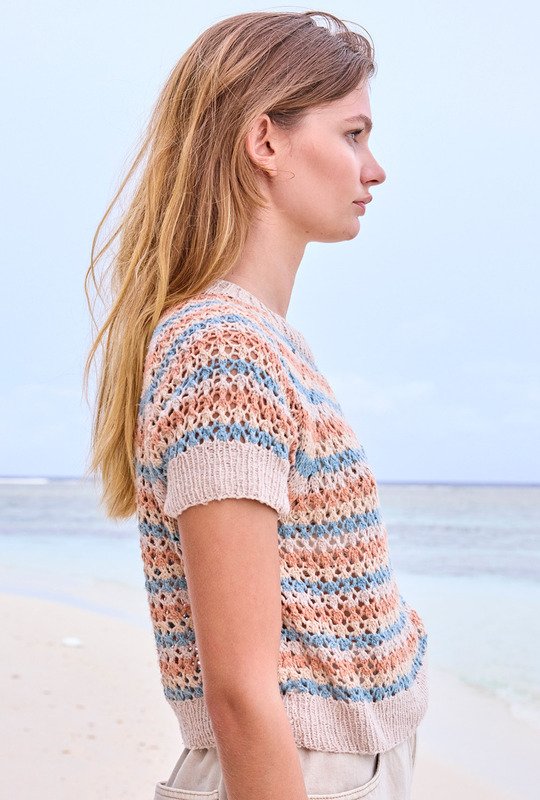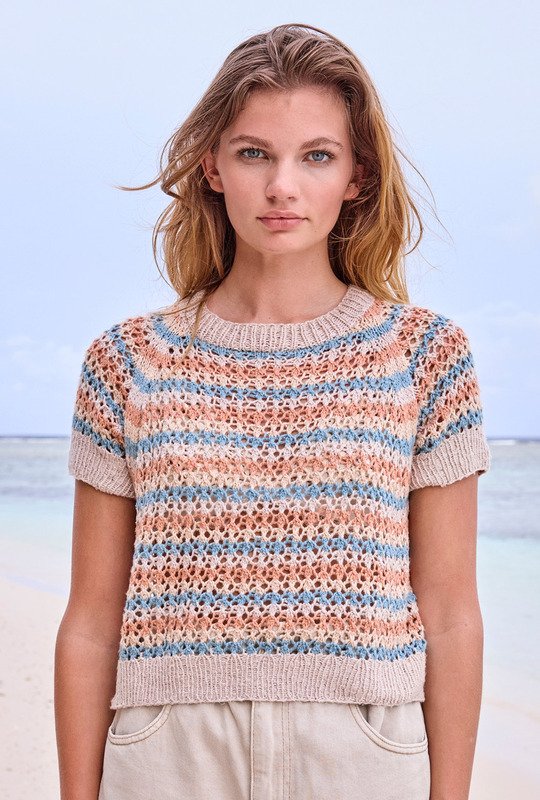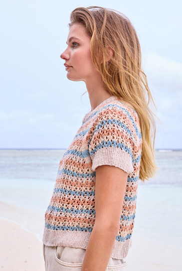 Die ausgeglichene Farbbalance dieses Strickshirts zeigt Harmonie rundum. Ein selbstverständlicher Look, weich in Material und Farbe - und ein sommerlicher Begleiter, der sich jedem Stil anpasst. Gestrickt wird das leichte Lace-Shirt von unten nach oben in Einzelteilen. Das Ajourmuster ist nicht sonderlich kompliziert und wird ausführlich Reihe für Reihe in der Anleitung erklärt. Sind alle vier Teile fertig gestrickt, werden noch alle Nähte geschlossen und aus dem Halsausschnitt die schmale Blende im Rippenmuster herausgestrickt. Am besten nimmt der fertige Pulli jetzt noch ein kleines Bad und wird im Liegen getrocknet. Dabei schön in Form bringen und glattstreichen – so öffnet sich das Lacemuster und entfaltet seine ganze Pracht. Tipp: So ein geringeltes Raglanshirt eignet sich auch hervorragend zur Resteverwertung und sieht auch mit mehreren Farben oder in knallbunt klasse aus!