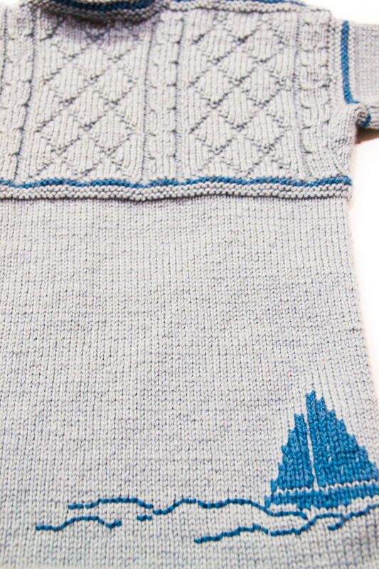 Kleine Seebären werden sich in diesem Guernsey so richtig wohlfühlen, da er doch der traditionelle Fischerpulli ist. Eine Tasche für Kleinigkeiten und ein Schiff, das sich schon mal auf die Reise macht, sorgen dafür, dass es auch der StrickerIn nicht langweilig wird und machen den Pulli zum Lieblingsteil. Das Garn fängt schon manchen Wind ab und wärmt daher schön.