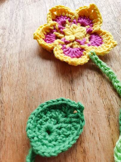 Die Blume hat mit dem angegebenen Garn einen Durchmesser von ca. 6 cm. Der Stängel ist ohne Blatt ca. 20 cm lang, kann aber auch ganz nach Belieben verlängert oder auch gekürzt werden.