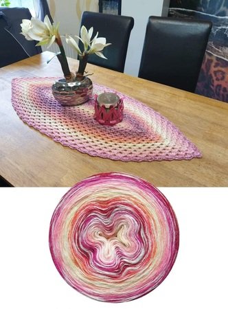 Dieser Tischläufer wird mit einem speziellen Anschlag begonnen, den ich Onschlag genannt habe. Er ist von beiden Seiten behäkelbar, was hier zu einer wunderschönen Mitte führt. Diese Art des Anschlags ist nicht schwierig und ausführlich erklärt. In der Anleitung findest Du eine Verlinkung zu einem Video-Tutorial bei YouTube.