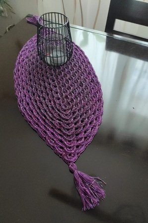 Ich habe (inkl. Quasten) ca. 700 m Lauflänge eines Bobbels mit 4 Fäden plus Lurex mit NS 5 verarbeitet. Meine Empfehlung ist, kein dickes Garn zu verwenden. Mein Tischläufer hat ungespannt eine Länge von 100 cm (130 cm mit Quasten) und eine Breite von 40 cm. An den Quasten habe ich 2 Zierperlen angebracht, die ich noch im Haus hatte.