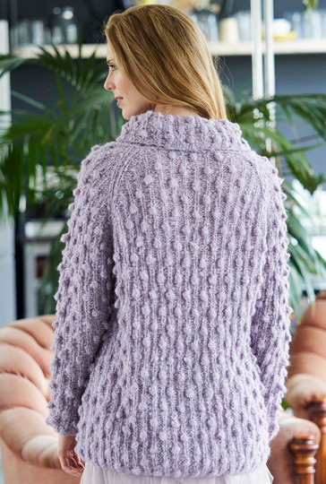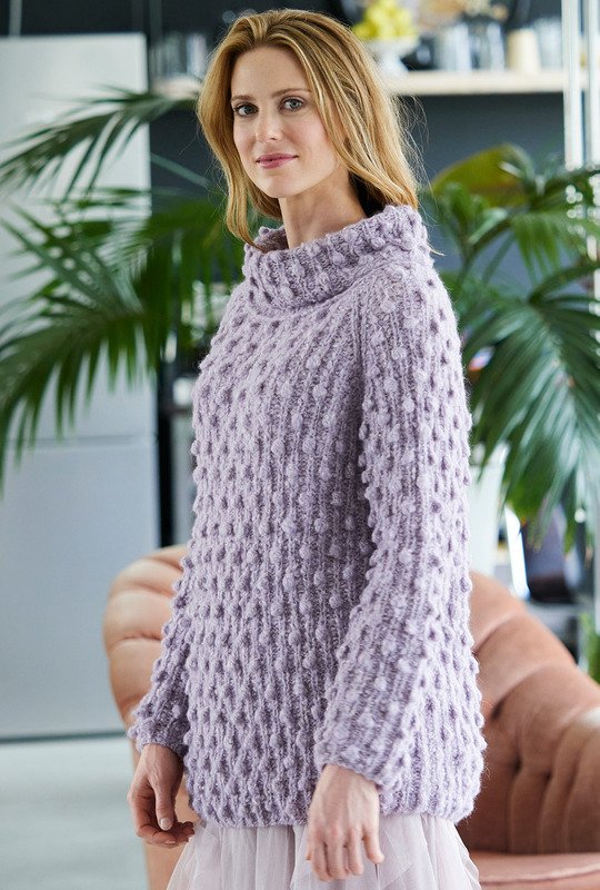 Wohlfühlen lautet die Devise – überzeugend dargestellt durch diesen femininen Maschentraum, bei dem sich Noppe an Noppe zu einem wunderbar weichen "Ich-mach mir‘s-gemütlich-Pulli" zusammenfügt. Damit es perfekt ist, wurde für dieses Design auch ein absolutes „Wohlfühlgarn“ ausgewählt: Der hohe Anteil Baby-Alpaka sorgt für ein leichtes, weiches und warmes Tragegefühl und hüllt uns ganz sanft ein. Das Muster ist nicht kompliziert und Noppen stricken sich schon fast mediativ – ein sehr entspannendes Projekt. Gestrickt wird in Einzelteilen von unten nach oben. Nachdem alle Teile fertig und die Nähte geschlossen sind, wird der angenehm locker fallende Kragen aus dem Halsausschnitt herausgestrickt.