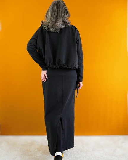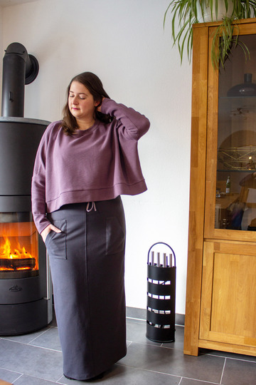 Zusammengefasst: Dieser Schnitt bietet dir einen bodenlangen Rock mit Schlitz, verschiedenen aufgesetzten Taschen und einem doppelten Bund für mehr Tragekomfort.