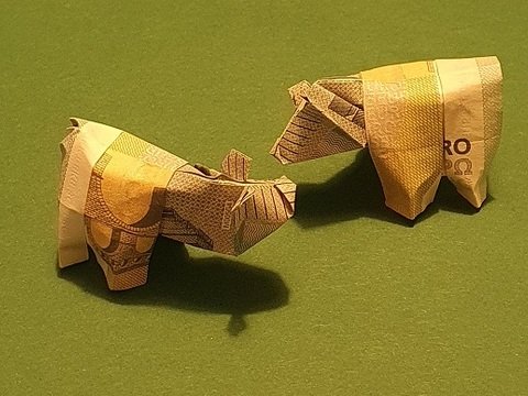 Das fertig gefaltete Objekt, aus einem 5 Euro Geldschein, hat später eine Länge von ca. 10cm, eine Höhe von ca. 6cm und eine Breite von ca. 2,5cm