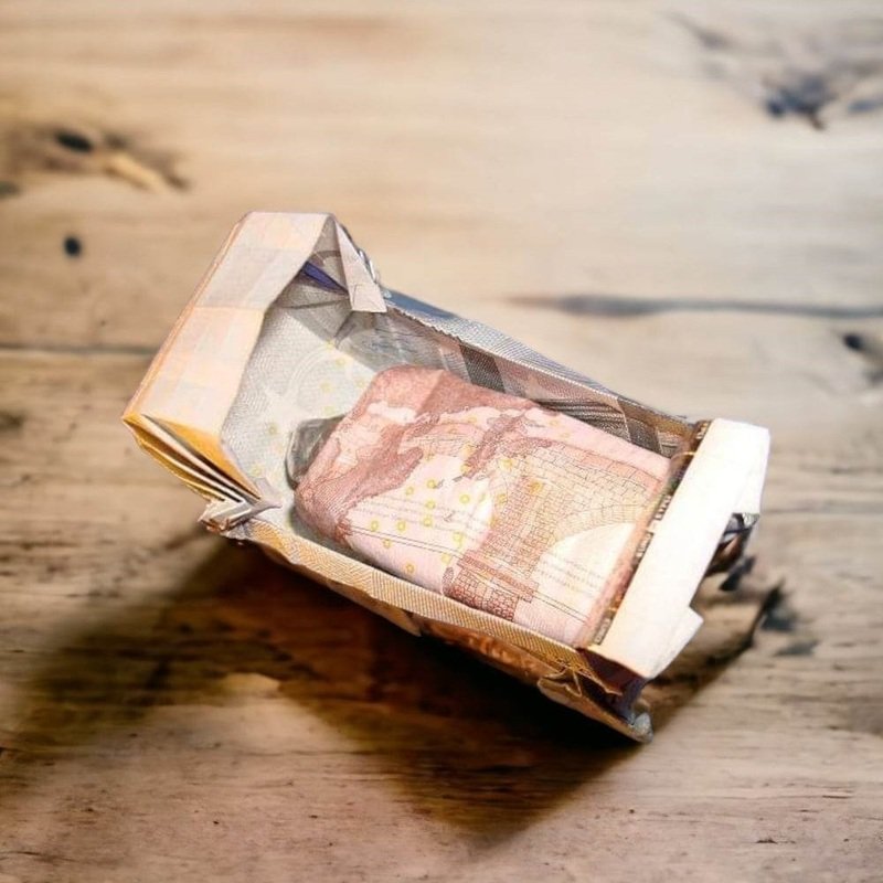 Dieser Kinderwagen kann aus jedem Euro Geldschein oder aus jeder anderen Währung gefaltet werden. Hier im Foto ist er aus drei 5 Euro Geldscheinen gefaltet. Das Kind mit Bettdecke ist aus einem einzelnen 10€ Geldschein gefaltet.