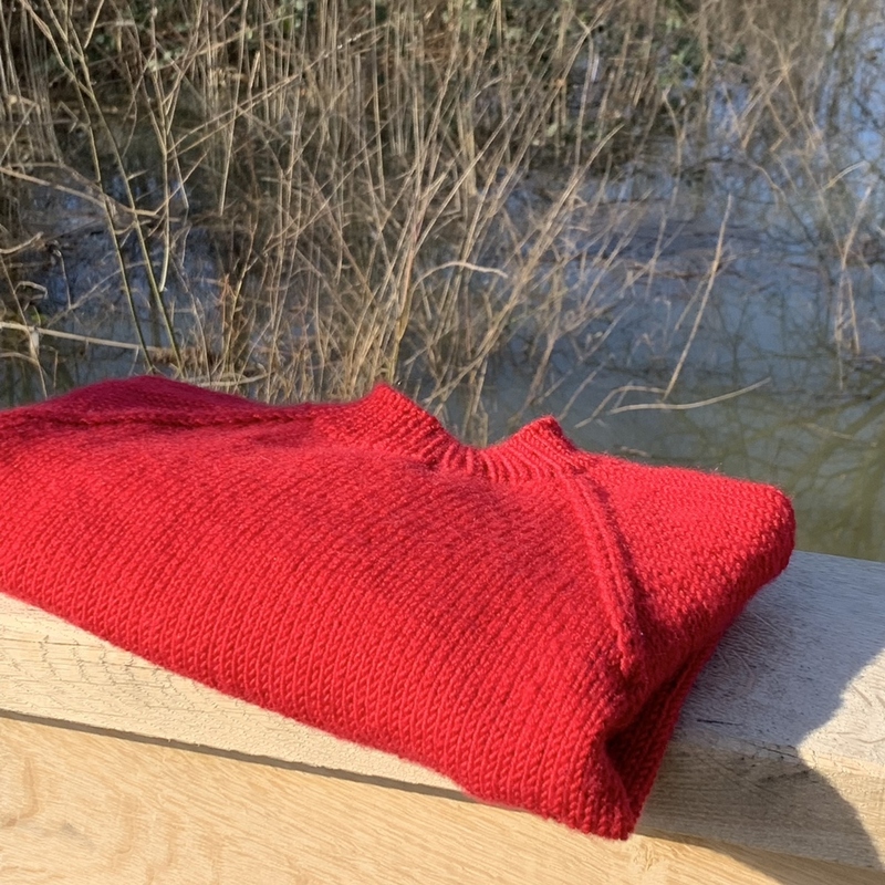 Er wird von unten nach oben gearbeitet. Zuerst wird der Rumpf und dann die Ärmel gestrickt. Bei der Raglanschräge werden alle Teile auf einer Nadel genommen und in Runden weitergestrickt. Später wird der Halsausschnitt geformt und das Bündchen angestrickt. Somit muss nur die Unterarmnaht mit einem Matratzenstich zusammengenäht werden und das kleine Loch das unterm Arm entsteht mit ein paar Stichen geschlossen werden.