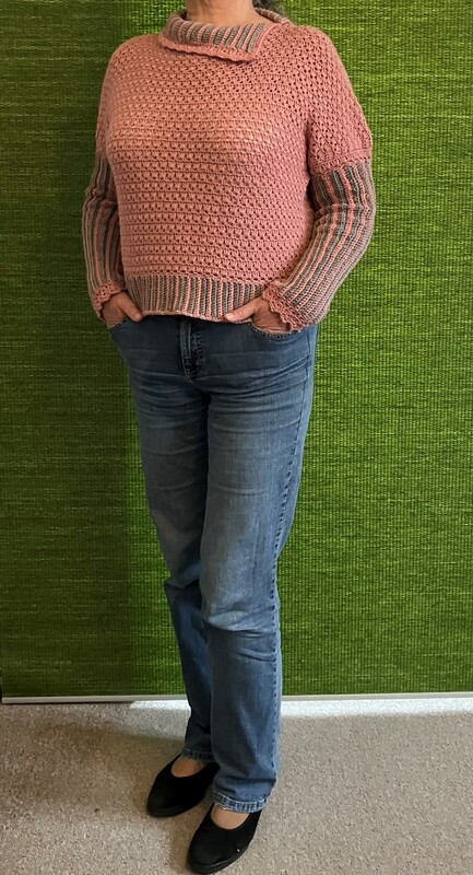 Ein Vintage-Kurz-Pulli mit schrägem Kragen. Die Ärmel sind körperbetont gehalten und bilden einen Kontrast zum restlichen eher weit gehaltenen Pulli. Die Farben Altrosa (= rosa mit ein wenig schwarz dabei) und Grau sind Farben, die sich wunderbar ergänzen, und zusammen edel aussehen. Aber selbstverständlich kannst du beliebige andere Farben für den Pulli verwenden, z.B. pink oder rot. (siehe Foto)
