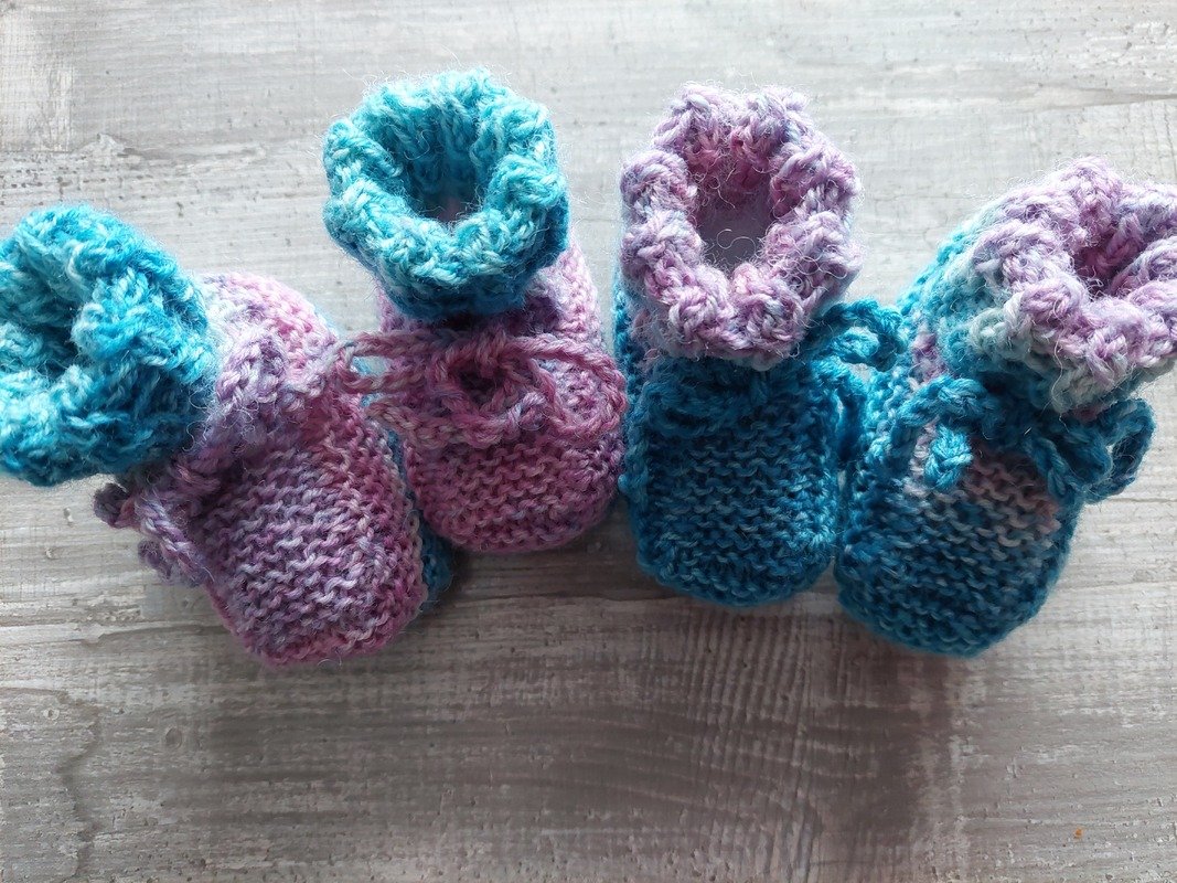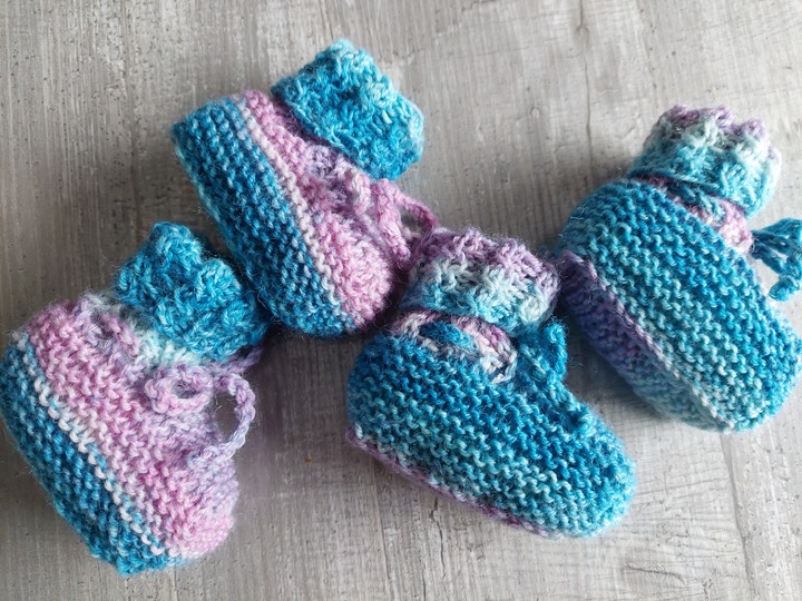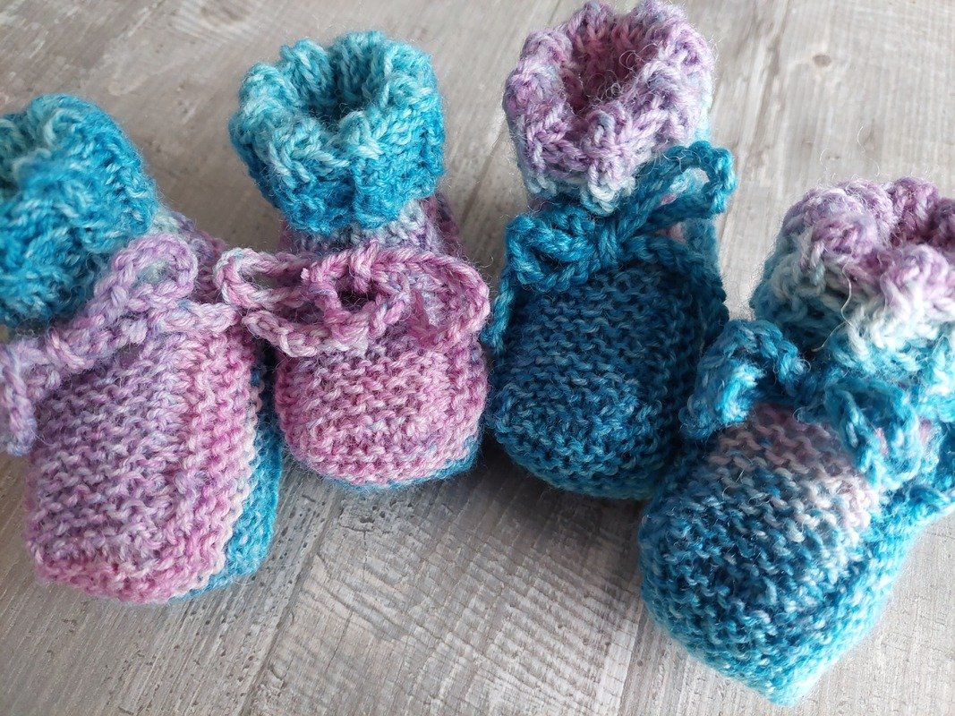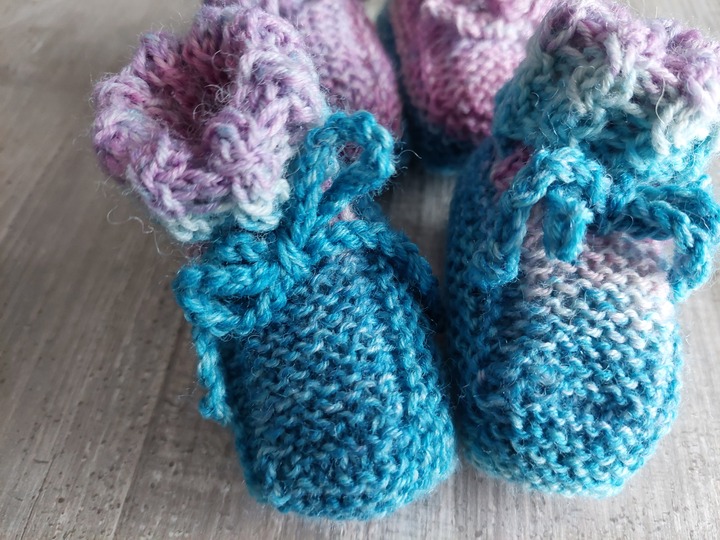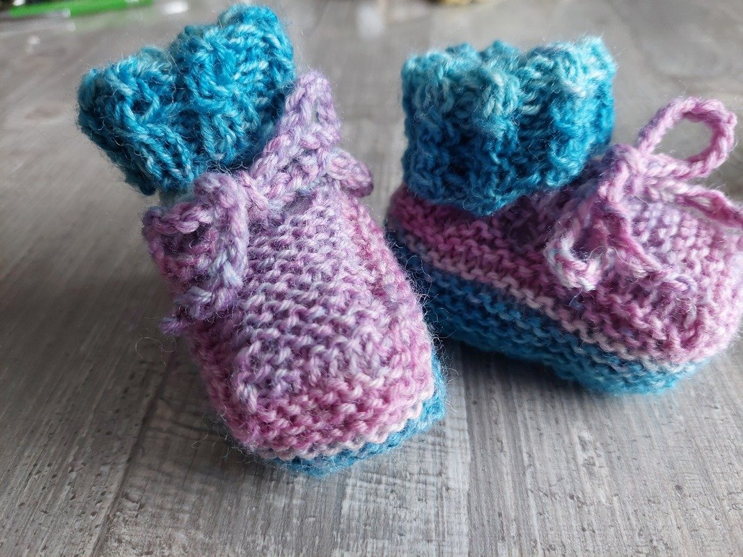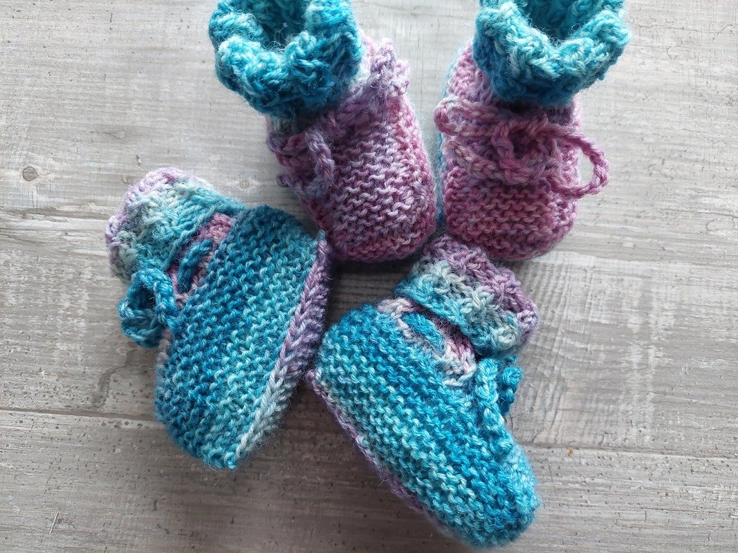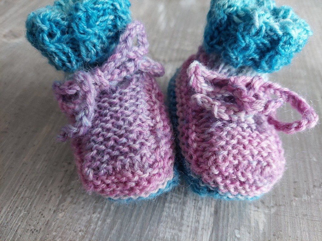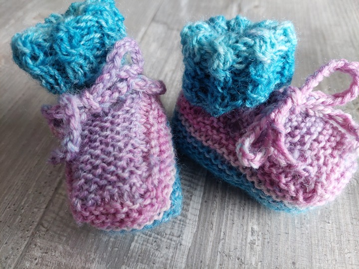 Diese Babyschuhe sind in einem Stück aus Sockenwolle gestrickt.