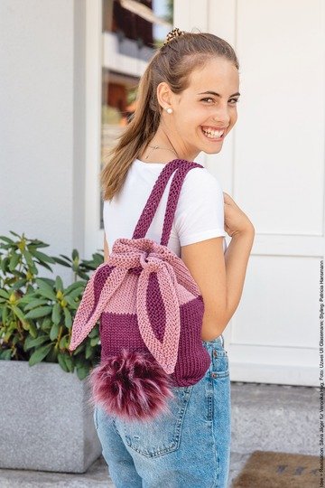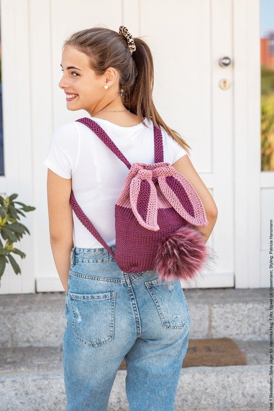 liebevollen Details wie Ohren oder Puschel-Schwänzchen machen aus dem praktischen Begleiter das Lieblings-Täsch-chen fürs Kindergarten- oder Schul-Kind. Und dass auch Teenager ihr Entzücken nicht verbergen können, hat unser Model beim Fototermin bewie-sen – ich glaube, das fröhliche Lachen bedarf keiner weiteren Erklärung. Die ROPE gibt es in vielen verschiedenen Farben, so kann der Hase auch artge-recht in Brauntönen gestrickt werden. Gut vorstellen kann ich mir hier aber auch ein Exem-plar in Blautönen – ich bin