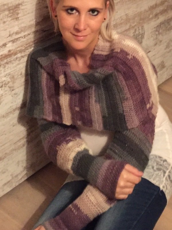 Hinweis: Beim vorgestellten Produkt handelt es sich NICHT um die fertig gehäkelte Jacke, sondern lediglich um eine Schritt-für-Schritt-Häkel-Anleitung, die Dir dabei hilft, selbst diesen Ärmelschal zu häkeln.